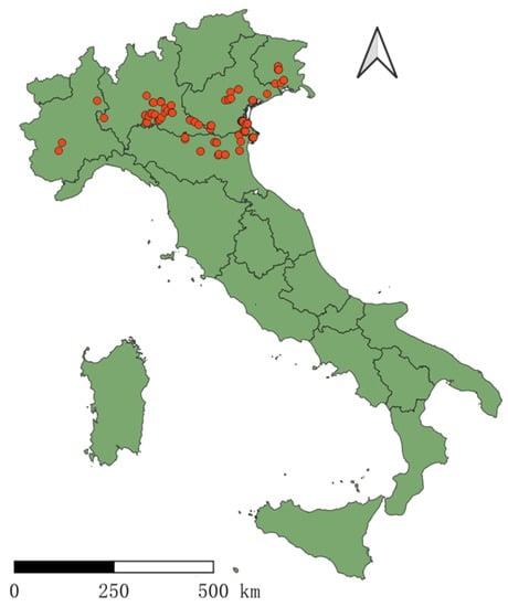Study fields located in northern Italy, marked by red points.
