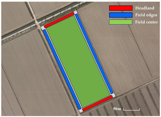 In this study, the focus was on maize, a crucial crop in northern Italy with an average yield of 8 to 10.6 t/ha in the last ten years []. The fields were selected using the OneSoil [] website and EU-CROPMAP 2018 [,], which identified the crops grown in different fields for the years between 2016 and 2018 and confirmed the crop type for the year 2018, respectively. Only fields where maize was planted in the same positions (headlands, field edges, and field centres) were considered. The rotation patterns of other crops were not considered. However, the focus on maize was deemed sufficient to achieve the study’s objectives of analysing the differences in yield and vegetation indices between the headlands, field edges, and field centres. The fields selected for this study were chosen based on their regular rectangular shape. The selection was carried out visually, by hand, without specific screening criteria. The regular shape was important for maintaining consistency among the selected fields and provided more disciplined traffic conditions than irregular fields. A certain tolerance for the angle requirements was allowed during the selection process, as it was recognised that obtaining strictly standard fields can be difficult.