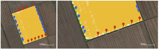 - Field Edges: The area on the two opposite edges of the field where the farming machinery moves in a linear direction during the farming operation (blue).