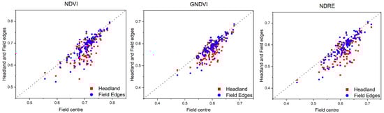 The comparisons between the field centre with the headland and field edges in the NDVI, NDRE, and GNDVI are shown in Figure 5. The red points represent the value of the headland and field centre, and the blue points represent the value of the field edges and field centre. Among all 111 fields, 96/111 (86.5%) of the headland and 93/111 (83.8%) of the field edges were lower than the field centre in the NDVI. Furthermore, 96/111 (86.5%) of the headland and 94/111 (84.7%) of field edges were lower than the field centre in the GNDVI. As for the NDRE, 103/111 (92.8%) and 97/111 (87.4%) of the headland and field edges, respectively, were lower than the field centre.