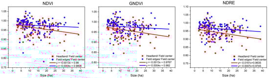 The headland/field centre trend line (red line) showed a steeper slope in all three VIs than the field edges/field centre (blue line). As shown in Figure 6 he value differences between the headland, field edges, and field centre increased along with the field size. No significant correlations were found between the headland, field edges, and field centre in the NDVI, GNDVI, and NDRE. The p-value was higher than 0.05 and lower than 0.169 in the six comparisons of H/C and L/C in the NDVI, GNDVI, and NDRE