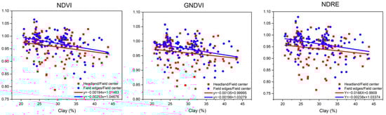 Figure 7 shows the correlation between the clay content and VI differences (%) of the headland (red point, H/C) and field edges (blue point, L/C) with the field centre. The red points represent the value of the headland/ field centre. The blue points represent the field edges/ field centre. The red and blue lines are the trend lines, respectively. The field’s clay content range was from 20.63% to 43.70%. The results showed that the value differences between the headland and field edges with the field centre increased as the clay content decreased. Furthermore, the value differences between the headland and field edges with the field centre narrowed as clay content increased.
