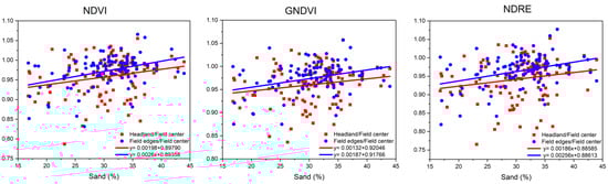 Figure 8 shows the correlation between the sand content and VI differences (%) of the headland (red point, H/C) and field edges (blue point, L/C) with the field centre. The value differences between the headland, field edges, and field centre were calculated from the average of three years from 2016 to 2018. The red points represent the value of the headland/ field centre. The blue points represent the field edges/ field centre. The red and blue lines are the trend lines, respectively.