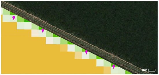 Methodology of the data collection: The pixel size is 10×10 m which was selected from the GEE. It is quite a large area if the field is not of a large size. The previous study even divided the headland area into three areas: field edge, turning, and transition areas to study the performance difference between the three []. So, it could be possible to find a higher value difference between the headland, field edges, and field centre if the resolution is higher than 10 × 10 m. Additionally, not all of the pixels selected during this study were parallel-selected with the field boundaries, as shown in Figure 9. The purple nails were the data collection points, which means that the results underestimated the yield reduction in the headland and field edges because the pixels were more distant from the field boundaries, rather than located precisely on the field boundaries. So it means that if the resolution of the pixels was higher than 10 × 10 m, as in this study, more yield losses or lower VIs could be found in future research studies. Moreover, in future studies, these could be tested by comparing the parallel and non-parallel fields.