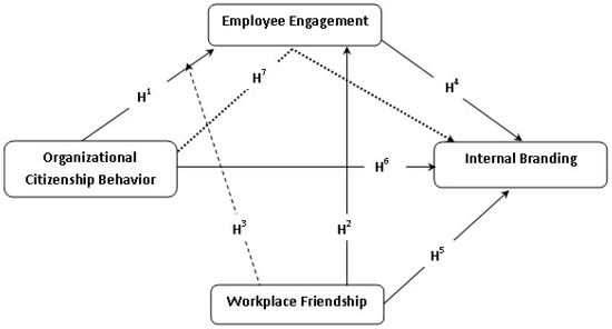However, it may be difficult to create a consistent corporate brand in the service industry since services are complicated and intangible [10], as well as being made up of people-based procedures wherein personnel may either improve or harm a corporate brand [11]. Regarding the research gap, there are surprisingly few studies regarding internal branding and its antecedents, perhaps as a result of their roots in different disciplines [12], particularly in the hotel industry context. Furthermore, there haven’t been many studies conducted from the perspective of employees on topics related to internal branding [13]. There haven’t been many studies, particularly on the impact of friendships at work on employees and organizations [14]. Even though there are a growing number of studies on internal branding, there are demands for further investigations into the organizational elements that help or hinder the targeted outcomes [15]. A healthy working environment among workers increases the likelihood that an internal branding program will be implemented successfully since the strong brand attachment will foster and enforce engagement [16]. Because the comfort levels among peers and supervisors contribute to employees’ engagement, cohesion in companies is a fundamental aim for internal branding programs [9]. Therefore, workplace friendship could be a critical part of any internal branding program. Workplace friendship connects colleagues, fosters a positive work atmosphere, and builds a cohesive team [17]. This type of relationship has a strong positive influence not just on group work performance but also on enhanced OCB and decreased harmful behaviors [18]. Consequently, EE, WF, and OCB are critical organizational factors that should be integrated into the body of knowledge of internal branding and, thus, were investigated. Therefore, the current study investigated three variables: organizational citizenship behavior (OCB), employee engagement (EE), and workplace friendship (WF), all of which could interact with internal branding in the hotel context. This study could contribute to a better understanding of the concept of internal branding in the context of the hotel industry. Also, it may help establish new links between internal and external customers of relevant organizations by engendering and sustaining relationships between consumers and products.