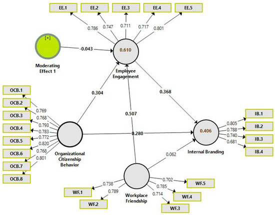 To assess employee engagement (EE), a 5-item scale (EE1, EE2, EE3, and EE4) derived from Fleming and Asplund [56] was employed. For example, “Every day at work, I get the opportunity to perform what I do best”, and “My hotel’s mission or purpose helps me feel how much my job is important”. Workplace friendship (WF) was measured using another 5-item scale (WF1, WF2, WF3, WF4, and WF5) derived from Nielsen et al. [57]; for example, “I have the opportunity to create good relationships in this hotel” and “Outside of the hotel, I socialize with my coworkers”. Furthermore, a four-item scale (IB1, IB2, IB3, and IB4) derived from Matanda and Ndubisi [58] was utilized to assess internal branding; for instance, “The brand values of our hotel serve as a guide in how I interact with guests” and “brand values are included in our training in this hotel”. Organizational citizenship behavior (OCB) was measured using an 8-item scale (OCB1, OCB2, OCB3, OCB4, OCB5, OCB6, OCB7, and OCB8) that was derived from Podsakoff et al. [59]; for example, “Employee assists others with severe workloads” and “Employee thinks about how his/her activities may affect coworkers”. Prior studies by Dipaola and Tschannen-Moran [60] and Dipaola et al. [61] found OCB to be a one-dimensional construct because organizations, as in the case of hospitality enterprises, are people-helping ones, and thus employees are dedicated to acting in their coworkers’ and guests’ best interests.