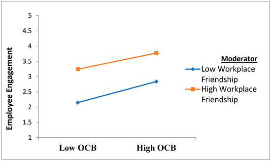 Furthermore, WF dampens the positive relationship between OCB and EE. This finding is consistent with the findings of Guohao et al. [73], who found that when there is a low level of WF, the relationship between OCB and EE is higher, while when there is a high level of WF, it is lower. Friendships at work have a detrimental impact on EE [29]. Having friends at work may be a bad distraction since it tempts coworkers to participate in extra socializing or talks unrelated to their tasks, which has a negative influence on their productivity. It also takes time away from doing job-related activities when people listen to their colleagues. Besides, while some friendships appear to be simple, others may require significant emotional effort to keep up. People who have close friends may believe that they must spend time and effort at work with their friends to preserve their relationships, which lowers their level of engagement at work.
