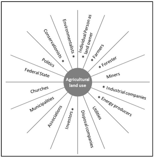 Regarding the first research question and our own developed simplified land use classification approach (Table A1) and mixed methods approach, we identified 16 stakeholders with an interest in agricultural land (Figure 2). Some of these stakeholders are mentioned more frequently than others. From this, we could deduce that these stakeholders show an increased interest in agricultural land.