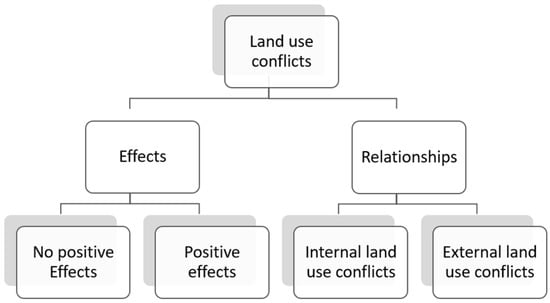 Thus, as a result, we can summarize that the land use conflicts related to agricultural land can be divided into external and internal land use conflicts (Figure 4).