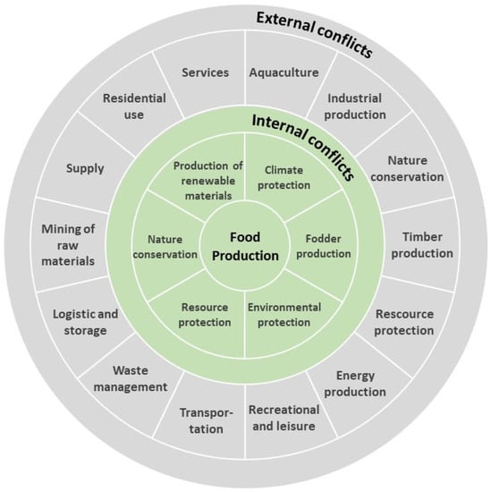 Schematic representation of the identified internal and external conflict relationships between land use objectives. External conflicts: no agricultural activity; internal conflicts: agricultural activity.