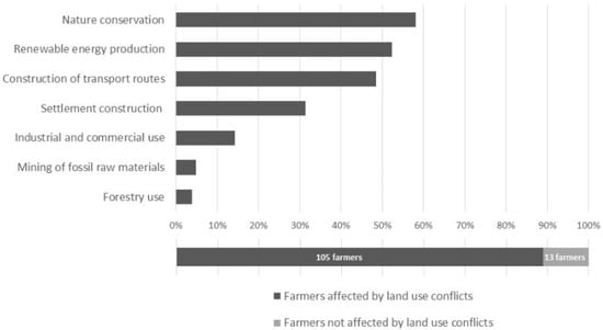 In the online survey of Brandenburg farmers, 105 out of a total of 118 farmers stated that they had already been confronted with land use conflicts at least once (Figure 5). Most land use conflicts occurred between agricultural use and nature conservation as a part of environmental protection (58%), the production of renewable energy (52%), and the expansion of transport routes (49%).