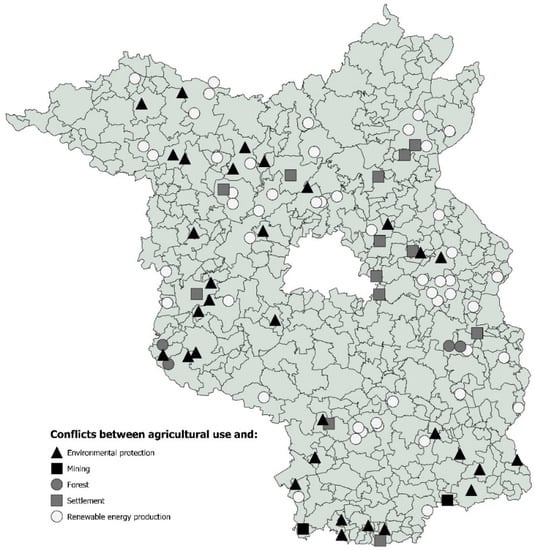 Based on the document analysis, we were able to identify and locate a total number of 96 conflict situations between agricultural production and other land uses that still existed at the time of our investigations. Seven conflict situations were concluded, resulting from the evaluation of a court decision. Thus, based on the document analysis, we have identified and localized a total of 103 land use conflicts in a period of 20 years from 2000 to 2020 (Figure 6). The conflicts that occurred most frequently were between agricultural production and renewable energy production (49 conflicts), environmental protection (41 conflicts), and the use of agricultural land for construction projects such as settlement, transport routes, and industrial plants (13 conflicts).
