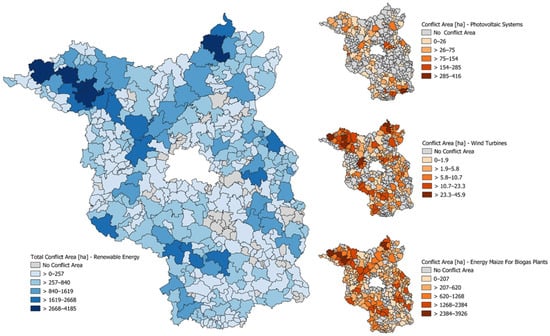 As a conflicting area connected with the production of regenerative energies by biogas plants, only maize cultivation area was considered within the scope of our investigation. Based on a determination of demand, this resulted in a conflict area of 111,042 hectares distributed over 8446 arable fields. The spatial pattern revealed a dominance in the northeast and northwest of Brandenburg. A summary figure (Figure 7, left) is given, with all three energy sources showing the carrying loss of land between 0.01 and 4185 hectares per municipality. The highest values were again in the northwest and east, while lower values dominated in the southern part.
