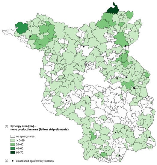 Land use synergies on agricultural land; (a) distribution of agricultural synergy areas with respect to fallow strip elements; (b) localization of established agroforestry systems.