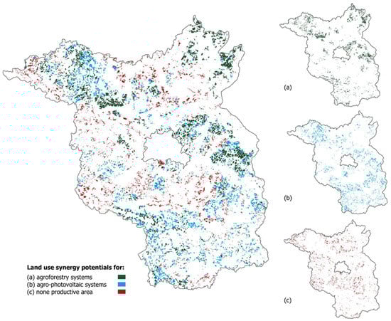 Figure 10a shows the distribution of areas with high synergy potentials regarding agroforestry systems. Especially in the northwest, northeast, and east of Brandenburg, synergy effects can be expected if agroforestry systems have been established and managed in a site-adapted and targeted manner. Figure 10b shows the distribution of areas with high synergy potential regarding agri-photovoltaic systems; in the northwest and east to south of Brandenburg, increased synergy potentials could be localized in connection with the establishment of agri-photovoltaic plants. In the west and northeast, only a few areas could be localized with synergy potentials in connection with such plants. Figure 10c shows a broad distribution of localized areas on which land use synergies in connection with the establishment of nonproductive areas such as fallow land or landscape features are expected. The regions in which the nonproductive area can lead to synergy effects are particularly located in the north, on the northwestern border of the state, in the west, and in the center of Brandenburg, which is south of Berlin.