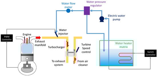 The engine test bench consisted of a 1.3 L IAFM engine with a turbocharger mounted to the exhaust manifold system. The stock engine was equipped with all the essential sensors connected to the data acquisition system. The engine was controlled by the stock engine control unit (ECU). Figure 1 shows a detailed overview of the PTWI experiment setup. The WI system consisted of a water tank with a heater matrix, electric water pump, water pressure regulator, water flow meter, and was completed by a water injector.