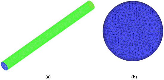 (a) Cylindrical domain for fluid flow computation; (b) Meshing at the cross sectional of cylindrical domain.