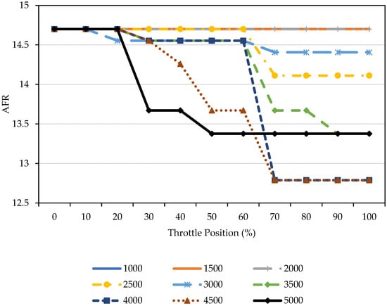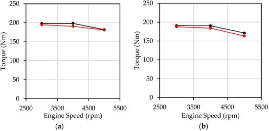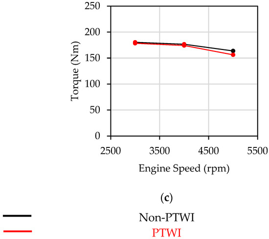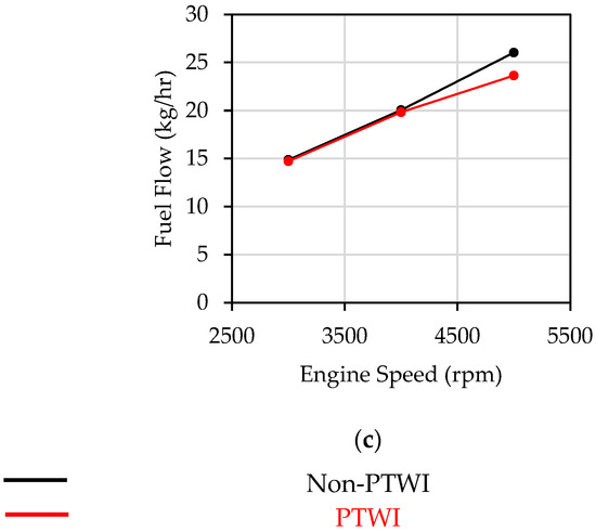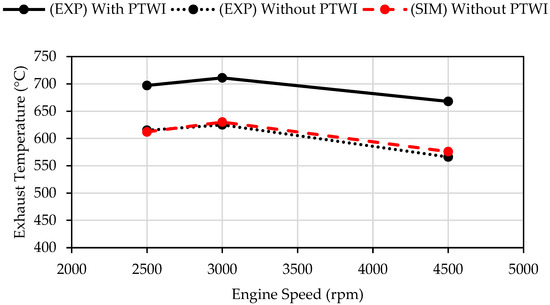 The exhaust gas temperature may also exceed 900 °C, which will cause the exhaust manifold and turbocharger turbine side to reach an extreme temperature. The turbine inlet temperature (TIT) is the critical parameter that needs to be maintained below 930 °C so that it is below the permissible thermal limit of the turbine vane and catalytic converter. Fuel enrichment is the commonly used method to control the temperature of combustion and exhaust gas. Thus, the fuel consumption of a small displacement boosted engine is higher during high load engine operation. One of the limiting factors of the performance of a boosted engine is the turbocharger TIT. Therefore, fuel enrichment is required to control the exhaust temperature. However, this method impacts fuel economy. As mentioned before, WI can maintain the combustion temperature, which means it can reduce the fuel consumption of the engine. It also allows the engine to potentially run at stoichiometric conditions, which eliminates the harmful gas in the exhaust gas and reduces brake specific fuel consumption (BSFC) while maintaining the performance.