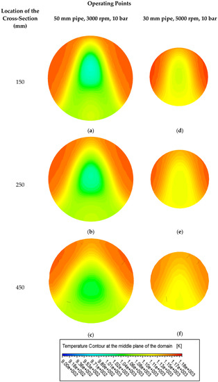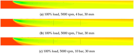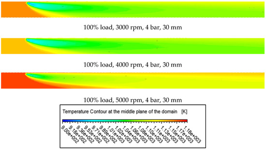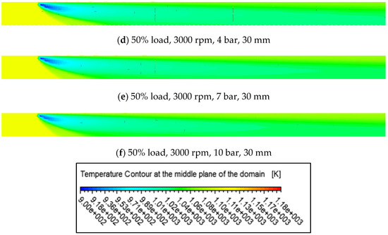 After the baseline CFD model was validated, the study conducted a few sets of sensitivity studies to investigate the effect of the PTWI on the TIT. They are the water injection pressure, the diameter of the turbine inlet connection pipe, and the distance of the injection point from the turbine inlet. All the sensitivity studies focused on the effect of PTWI at 3000 rpm, 4000 rpm and 5000 rpm at 100%, 75% and 50% engine load. This is because fuel enrichment is inevitable at the medium–high engine speed and load operation. Table 2 explains the combination of numerical simulation cases done in the research. Before that, the study set the three diameter sizes of the turbine inlet connecting pipe in the 1D engine model to obtain the temperature and pressure from the cases. The data obtained were plugged into the boundary condition of the air inlet in the CFD model for further action.