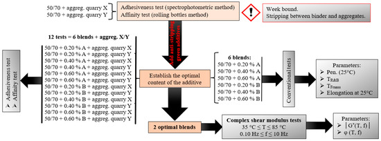 A total of six blends were tested to establish the optimal content of the two additives by performing a series of conventional tests: Penetration, softening point, and elongation tests. These tests were combined with the adhesiveness and affinity tests performed on the samples produced between the 6 blends and the two types of aggregates (quarry X and Y). A total of 12 spectrophotometric and affinity tests were performed.