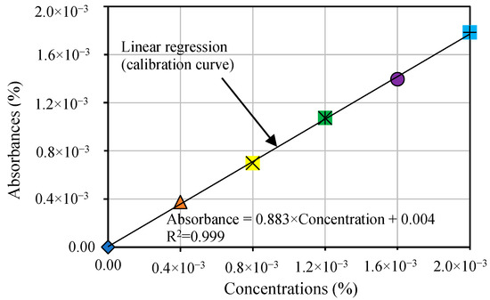 The absorbances were determined one by one in comparison with those of distilled water at the wavelength for which the absorbance of the dye solution was maximum. The determination of the working wavelength is achieved by measuring with a spectrophotometer the wavelength at which the absorbance value of the 0.1·10−3% concentration solution is at its maximum, using distilled water as a reference. The standard curve was plotted graphically, marking the known concentrations on the abscissa and the extinctions on the ordinate. Finally, a reference line (calibration curve) was plotted, as can be observed in Figure 2.