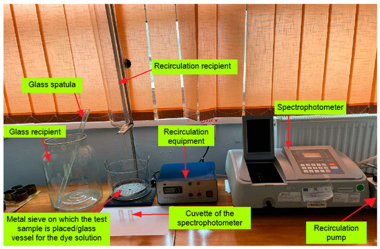 After recirculation, with the help of a pipette, the cuvette of the spectrophotometer was filled with dye solution from the glass vessel of the equipment and the absorbance A2 was determined spectrophotometrically, using distilled water as a reference. This result was then introduced into the calibration curve and the corresponding concentration, C2, was determined. A second test sample was tested following the same procedure.