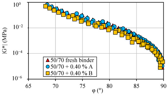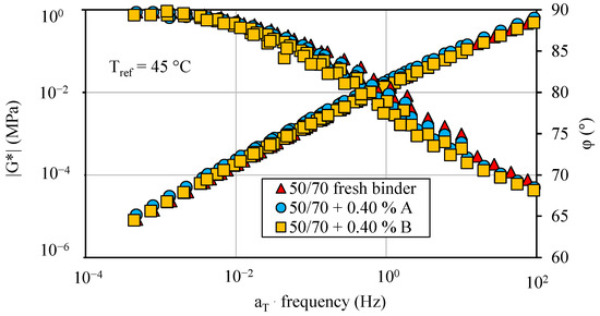 The master curves of the norm of the complex shear modulus |G*| and phase angle φ at a reference temperature of 45 °C were built for all binders (Figure 8).