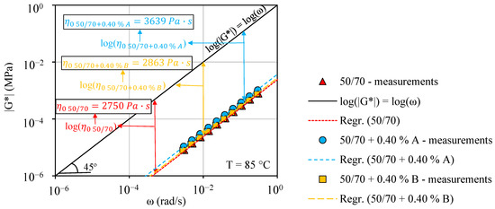 In Figure 10, the results for all tested binders of the norm of complex shear modulus are plotted as a function of the angular frequency (log–log scale), at a reference temperature of 45 °C. In order to determine η0 at 85 °C, the part of the plotted curve corresponding to the high temperature/low frequency was analysed by highlighting the Newtonian behaviour by performing a linear regression (45° slope line imposed). The results are plotted in Figure 10.