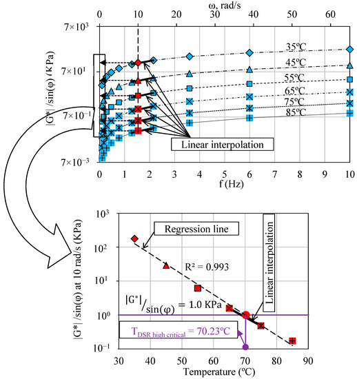 The same measurements were then used to obtain the DSR high critical temperatures by using the procedure proposed by Forton et al. [39] in which some linear interpolations were performed between the data at 1.29 Hz and 2.15 Hz, in order to determine the values at 10 rad/s.