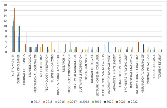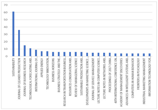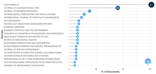 Journals in a particular field are divided into three categories according to Bradford’s Law [37]. According to the law, if journals in a field are categorized by article number into three zones, each with one-third of all articles, then the number of journals in each group will be proportional to 1:n:n×n. In this study, although the entire dataset contained five hundred and fifty-two sources, the output of the Bradford’s law analysis (Figure 5) illustrated that the top five journals were the Journal of Cleaner Production, Sustainability, Technological Forecasting and Social Change, International Journal of Hospitality Management and Journal of Business Research. While these five journals only published one hundred and thirty-one articles, which was 12.7% of the dataset, they can be understood as representing the essential knowledge in SEBM research, based on Bradfords’ law.