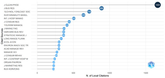 Figure 4 shows the top 20 most locally cited sources (from reference lists). Local citations measure how many times an article included in a dataset has been cited by the articles also included in the dataset. A cited source is a journal/book/conference proceeding series, etc., included in at least one of the reference lists (bibliography) of the dataset. This research detected 18,795 locally cited sources. The Journal of Cleaner Production stood out in first position with one thousand six hundred and sixty-five articles, in second position was the Journal of Business Research with eight hundred and eighty-nine articles and Technology Forecasting and Social Change was in third position with seven hundred and eighteen articles. In other words, the Journal of Cleaner Production had the greatest contribution within the research dataset.