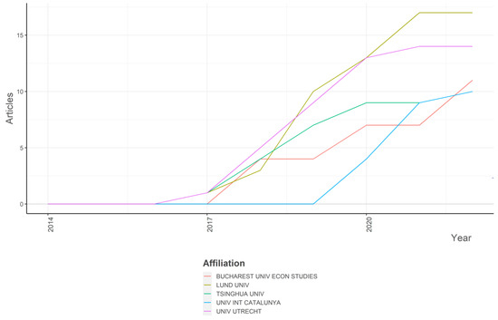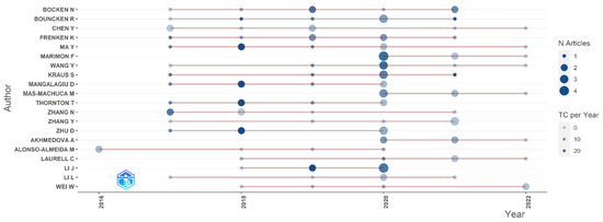 When analyzing author production chronologically over time, A. Akhmedova, M. Alonso-Almeida, N. Bocken, R. Bouncken, Y. Chen, K. Frenken, S. Kraus, C. Laurell, J. Li, L. Li, Y. Ma, D. Mangalagiu, F. Marimon, M. Mas-Machuca, T. Thornton, Y. Wang, W. Wei, N. Zhang, Y. Zhang and D. Zhu were the top 20 contributors who represented the chronological line of production, as shown in Figure 7. It is worth noting that all these authors contributed in the year 2020. However, fourteen of them published extensively in the period of time from 2017 until 2019, and four of them had no publications after 2020. New players, starting from 2020, were F. Marimon, M. Mas-Machuca and A. Akhmedova, while Y. Chen, Y. Ma, Y. Wang, C. Laurell and W. Wei were key players in the area, having contributed continuously throughout the period.