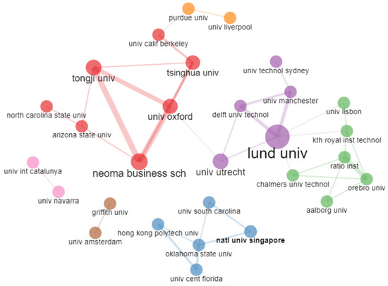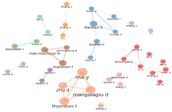 Co-authoring or collaboration network analysis facilitates the identification of how researchers, affiliations or countries are connected based on the number of publications they have co-authored [38]. With a 21.77% international co-authorship and an average of 2.76 authors per article (Figure 8), the SEBM area appears to be an international conversation and appears to be well collaborated in comparison to other research topics in the sharing economy field [3,38]. Nevertheless, the author networks shown in Figure 8 were small and had weak connections. With eleven networks detected, no network had more than eight nodes; thus, there was a low density of cooperative networks compared to scholars’ [3,39] reports of different studies.