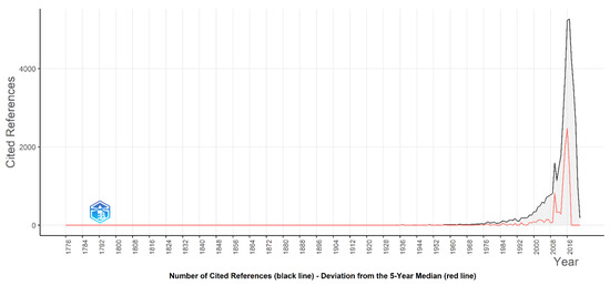 - Marx, W.; Bornmann, L.; Barth, A.; Leydesdorff, L. Detecting the historical roots of research fields by reference publication year spectroscopy (RPYS). J. Assoc. Inf. Sci. Technol. 2014, 65, 751–764. [Google Scholar] [CrossRef]