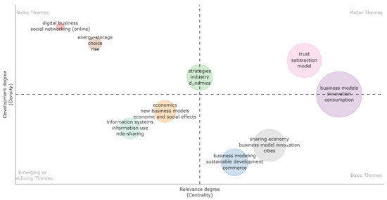 To holistically analyze the dataset, the Bibliometrix software in the R-package was utilized for a major part of the data analysis and visualization. Data (mainly keywords) and their interconnections were classified into themes in four categories: motor themes, peripheral themes, emerging or declining themes and basic and transversal themes. Similar studies have been employed for some sharing economy themes other than business models, such as the entire sharing economy as a field [3], co-working space in the sharing economy [33] and the sharing economy from a sustainable development perspective [34]. The bibliometrics accessed through this research included scientific productions by authors, affiliations, publishers and countries, citations and co-citations and networks among authors and countries, productivity and citation growth, keywords and their structure, the co-occurrence of author keywords and article references to thematic maps and thematic evolution. The visualization features were used to illustrate both the knowledge networks and conceptual development. The keyword co-occurrence network maps the proximity of words appearing together in individual documents, followed by a factorial analysis that reduces the data’s dimensionality through a multiple correspondence analysis (MCA). Some indicators used in the study are as follows: total citations—the number of citations received; h-index—the productivity and influence; m-index—the distribution of citations score in addition to influence and productivity; and g-index—the volume per year in the mentioned indicators.