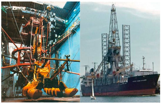 Ocean Management Institution (OMI) and Ocean Mineral Association (OMA) dragged sled-mounted mining collectors through the lifting pipes of mining vessels to passively move around the seabed with an operating water depth of 5200 m. They conducted three sea trials and collected a total of 800 t polymetallic nodules with a capacity of 40 tons per hour (as shown in Figure 1). As seen in the figure, both mining methods are based on towed collectors for collecting; the one on the left is the pneumatic lifting mining system designed by OMA, and the one on the right is the system of the hydrodynamic lifting method with submersible electric pumps adopted by OMI. The results obtained from this sea trial laid down the composition of the deep-sea mining system with the basic framework of a seafloor collector, hoisting system, and surface support system.