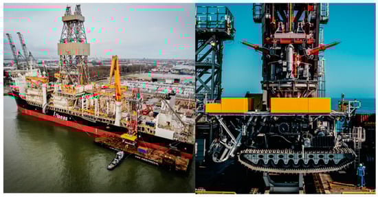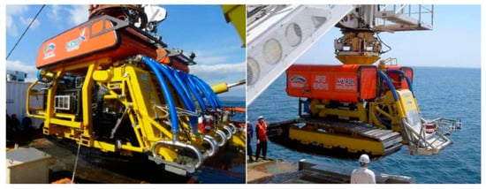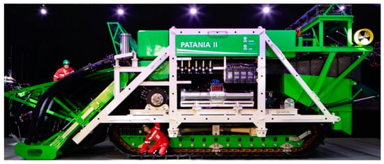 After completing the walking test of the 4571 m-deep mining vehicle in 2017, the Belgian GSR, together with the German Federal Institute for Geosciences and Natural Resources (BGR), applied to the International Seabed Authority in 2018 to carry out the mining vehicle walking and nodule collection tests in the International Seabed Polymetallic Nodule Exploration Contract Area, together with environmental impact assessment studies in conjunction with the tests [32]. In April 2019, the GSR developed a crawler walking and hydraulic collection test prototype (as shown in Figure 6). The sea trials started in the contract area. The sea trial’s depth was 4500 m, the size of the collector was 12 m × 4 m × 4.5 m, the weight in the air was 25 tons, the weight in the water was 8.5 tons, the production capacity was 110~120 t/h, and the collection depth was 5~12 cm. The test was interrupted, however, due to the failure of the optical fiber cable. In April 2021, GSR started the sea trial of the miner in the contract area again and completed the walking and collection test of the miner on the seabed in the contract area in May 2021. The driving distance was 54.2 km, and the cumulative running time was 107 h, which verified the feasibility of crawler walking and hydraulic acquisition technology. At the same time, the environmental impact test of polymetallic nodule-mining was carried out.