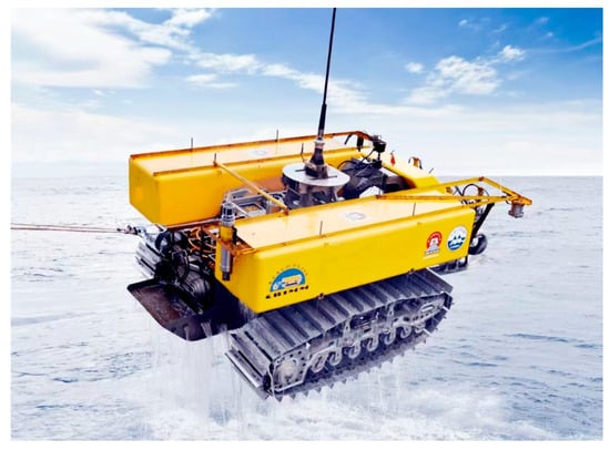 Since the 1980s, China has engaged in deep-sea polymetallic nodule technology research and development. The Changsha Research Institute of Mining and Metallurgy researched the crawler polymetallic nodule mine laboratory prototype in 1995. In 2001, the Changsha Institute of Mining Research, the Changsha Research Institute of Mining and Metallurgy, and other units jointly developed a 135 m water depth polymetallic nodule ore prototype with a capacity of 35 t/h, and completed a 143 m water depth lake test in Yunnan Fuxian Lake, which preliminary verified the walking collection function [27,28]. In 2018, the Changsha Research Institute of Mining and Metallurgy, combined with Central South University and other units, completed the development of the polymetallic nodules mining machine "Kun Long 500" (as shown in Figure 7) [33], completed the sea trial in the China South Sea, and verified the crawler walking mechanism and the hydraulic collection mechanism in the experiment. The authors and their team were involved in the pre-design and sea trials of this research. In the experiment, the maximum operating water depth is 514 m, the collection capacity of polymetallic nodules is 10 t/h, the longest distance of a single drive is 2881 m, and the underwater positioning accuracy is 0.72 m, which realizes the ability of the predetermined path in the autonomous driving mode, and a pentagram with a unilateral length of 120 m emerges from the seafloor along a set path [43,44].