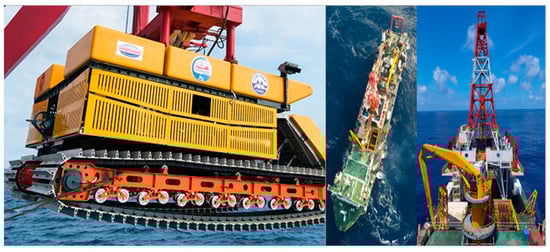 In 1997, Japan developed a towed ore-collection mechanism (as shown in Figure 3) and completed the offshore collection test in the 2200-meter deep-sea area [26]. In 2002, Japan’s JOGMEC developed a self-propelled ore-collector to complete the seabed walking test at a depth of 1600 m, and completed the seabed mining test in 2012. In 2020, JOGMEC collected 649 kg of cobalt- and nickel-rich seabed crust during a world-first test aboard the marine resource research vessel “Hakurei” [42].
