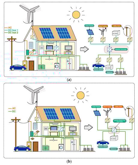 Figure 2 shows a conceptual DC power distribution architecture for future residential applications, in which there are multiple energy sources like wind turbines, PV modules, ESDs, and loads. Two distinct approaches allow obtaining a multiport system for such an application. The first one consists of connecting two DC buses rated at distinct voltage levels while using a bidirectional DC-DC converter known as an interlink converter (IC). In this scenario, SISO converters are controlled independently and associated with each individual source and/or load. The IC is responsible for the power management, as seen in Figure 2a, while requiring a proper communication system for exchanging information between the buses and ports. Although such configuration is predominant in most microgrids nowadays, it will inevitably require a large number of converters and higher implementation cost. Additionally, the communication-based control system is prone to a data-processing delay and errors that may affect the overall performance [34]. A MIMO converter can be used instead, resulting in the far less complex architecture shown in Figure 2b. The resulting structure relies on a single converter, while reducing the number of power processing stages.