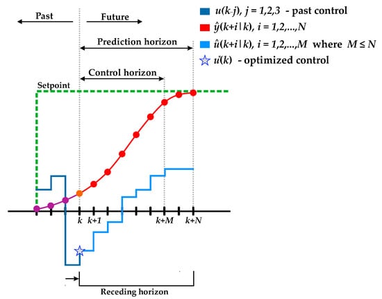 Figure 3 represents the operating principle of MPrC. The future values of the system states are predicted until a predefined time horizon using the model and the available information from measurements until time . The sequence of actuations is optimized over a control horizon by minimizing a cost function over the prediction horizon and the first element of this sequence is applied. This whole process is repeated for each sampling instant, using the new measured data and obtaining a new sequence of optimal actuations after each iteration. This is called a receding horizon strategy.