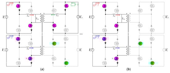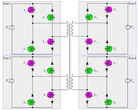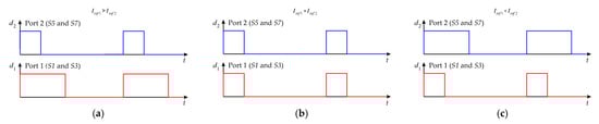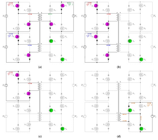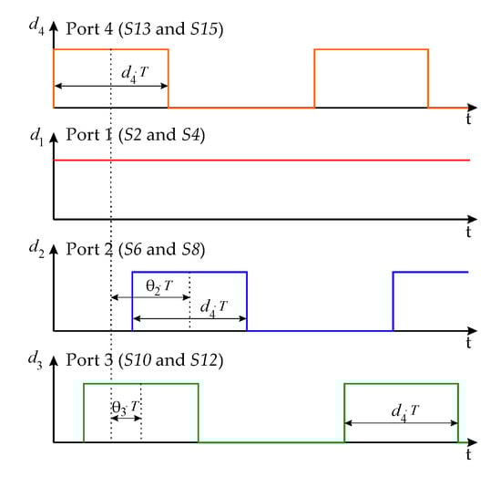 According to Figure 6, the pairs of odd-numbered switches in pink and even-numbered switches in green allows supplying and absorbing power, respectively. Additionally, the pair of even-numbered switches associated with the port that receives the highest amount energy will remain off during the whole process. In contrast, the duty ratios of other ports that receive energy are shifted with respect to the port that supplies the highest amount of energy. Owing to its multidirectional operation, a port can be responsible for supplying or absorbing energy while controlling the duty cycle or the phase-shift angle, respectively.