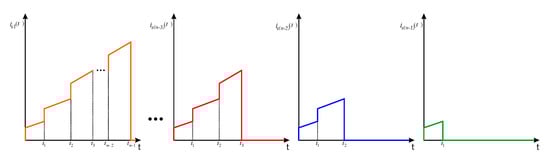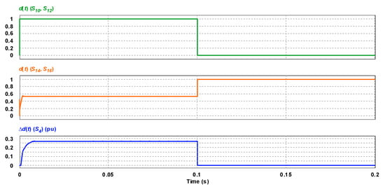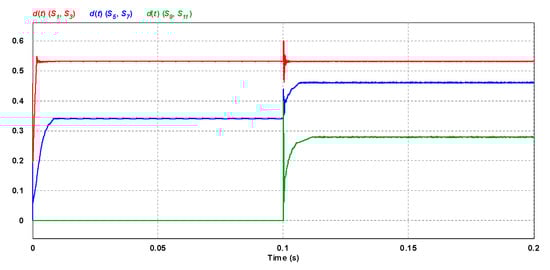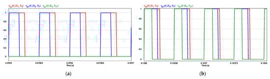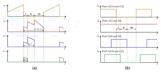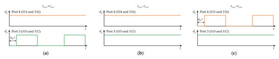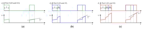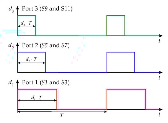 The most complex case during the charging process is assessed in detail, in which ports one, two, and three simultaneously supply power to port four, whereas . Thus, the odd-numbered switches S1, S3, S5, S7, S9, and S11 will be turned on, each pair with a respective duty ratio that depends on the amount of energy each port supplies. In addition, the drive signals are in phase with each other, i.e., the core is magnetized by all three ports simultaneously. The pulse width modulation (PWM) signals for the switches are shown in Figure 8.