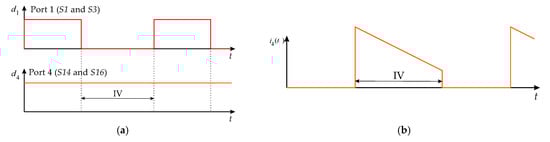 - At the end of step III, the odd-numbered switches of port one (S1 and S3) are off and the voltage across the coupled inductor changes its polarity, causing the series diodes to be forward biased. Then, since the even-numbered switches of port four (S14 and S16) were previously turned on, the discharging occurs through port four as in Figure 10d and Figure 11.