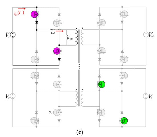 - In the first stage, the odd-numbered switches of ports one, two, and three (S1, S3, S5, S7, S9, and S11) are on. Thus, there are three sources (V) in parallel with the magnetizing inductance. As a result, the currents are equally shared to keep the current slope equal to V/Lm, resulting in i1(t) = i2(t) = i3(t) = V/3Lm, as in Figure 10a.