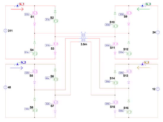 At this point, it is worth mentioning that the number of possible operating modes of the converter depends on the number of ports or windings. Therefore, the four-winding converter shown in Figure 6 can assume six possible configurations; that is, one port may supply energy to one, two, or three ports simultaneously, two ports may supply energy to one or to its remaining counterparts, or three ports may supply energy to a single one. This topology has a modular characteristic because it allows the incorporation of n windings and ports. However, the efficiency limits must be considered because the higher the number of switches and windings, the higher the losses and overall dimensions of the converter.