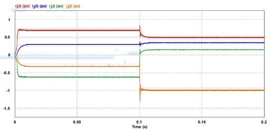 Port currents in pu when using the MPrC and PI controllers: (a) port 1, (b) port 2, (c) port 3, and (d) port 4.