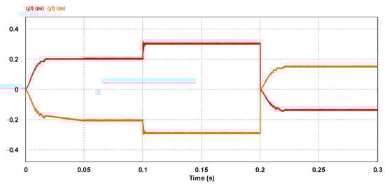 In the second interval () of Figure 35, the load demand decreases to 0.14 pu instead of 0.25 pu. Thus, the exceeding energy is injected into the battery, but there is still a surplus. Therefore, the utility will absorb it to maintain the balance between the generated and demanded power.