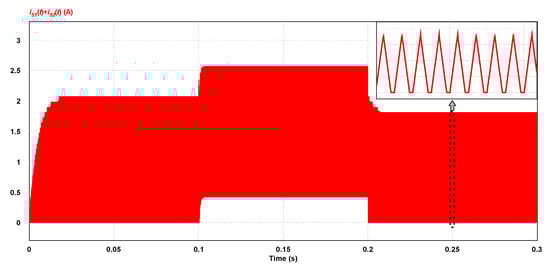 Similarly to the previous section, the discharge can also occur in one or more ports with different current ratings. In such a case, the magnetic energy is stored and then transferred to port four. Thus, the pair of even-numbered switches of port four (S14 and S16) must be on during the entire period T according to Figure 10. Besides, no energy flows through port four because the diodes are reverse biased in Figure 10.