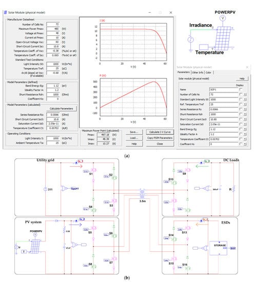 The PV system has a generation capacity of 480 W. Figure 32a shows the representative block of the PV system used in the simulation and the respective parameters. Moreover, the battery model shown in Figure 32b is described in detail in [47]. Figure 33b also shows the simulated circuit, which manages the power flow between the ports for the configuration proposed in Section 3.2 and follows the control actions represented in the flowchart of Figure 18b.